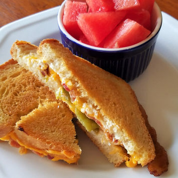 It's perfect for this crunchy, hearty grilled sandwich. It adds a tangy flavor that really enhances the Hatch chili, cheddar cheese and smoky bacon.