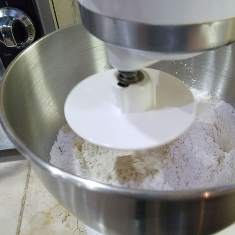 With the mixer running on low speed slowly add the warm water up to one cup until the dough begins to pull away from the sides of the bowl as shown above. If the dough has not fully combined, add warm water one tablespoon at a time until it does. Be sure to give it time to mix in before each addition. If the dough becomes too wet add a little more all purpose flour until it comes together.